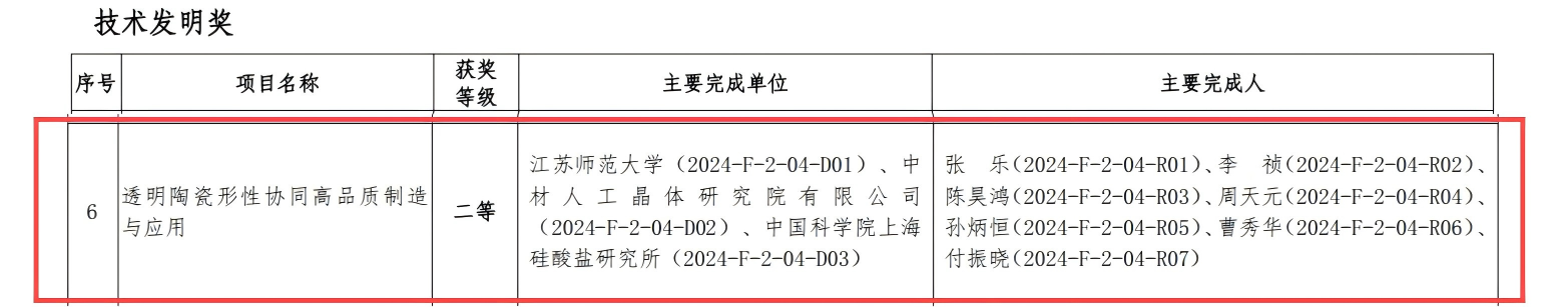 近日,中国建筑材料联合会与中国硅酸盐学会联合公布了2024年度建筑材料科学技术奖获奖名单。我院张乐教授团队的研究成果“透明陶瓷形性协同高品质制造技术与应用”凭借显著的技术创新性与行业应用价值,荣获技术发明奖二等奖。该奖项是经国家科技部批准设立的省部级科技奖励,旨在表彰推动建材行业绿色低碳安全高质量发展的重大科技成果。