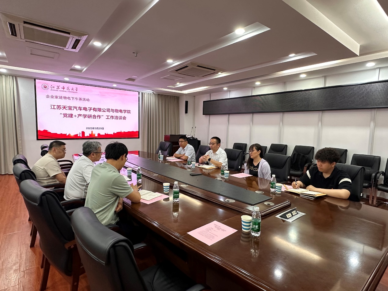 5月29日下午,物电学院党委举行“企业家进物电下午茶”活动。江苏天宝汽车电子有限公司研发部经理王福礼一行4人来物电学院开展“党建+产学研合作”洽谈。江苏天宝汽车电子有限公司研发部经理王福礼、技术中心电子工程经理舒彩云、人力资源部高级薪酬专员兼第一党支部组织委员朱灿灿、技术中心结构工程师兼第一党支部宣传委员王超崧参加座谈。物电学院党委书记王夫寿、副院长张乐及电子系教师刘逢雪接待来访客人。会议由王夫寿主持。