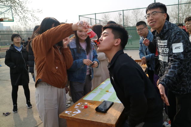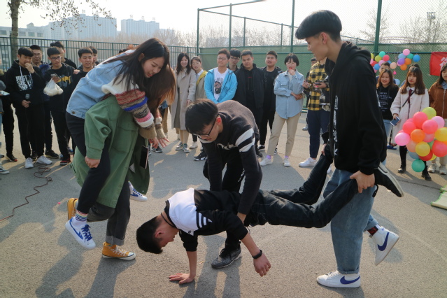 第二个游戏“你说我做”中,三男两女为一组,根据指令完成裁判员所要求的动作,每个动作需定格3秒才算过关,游戏中男生充分表现出担当精神,全力以赴,女生也毫不逊色,协调四肢,完成一些高难度动作。每个游戏结束后都有抽奖环节,男生们努力奔跑尽可能为女生们赢取更多礼物,现场的气氛十分热烈。最后一个环节为“踩气球”,参与者尽情奔跑,充分展示出男女同学的青春活力,活动在欢声笑语中结束。