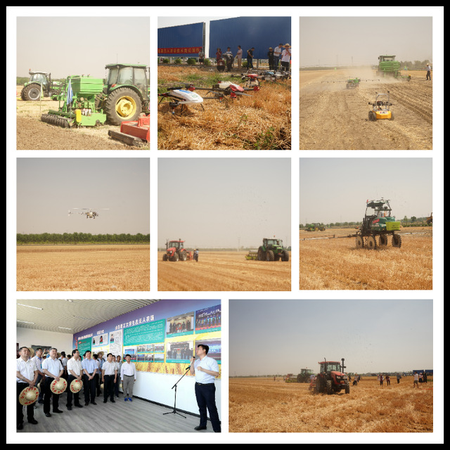 随着解说员的介绍,无人农场指控中心与云平台监控系统、秸秆粉碎灭茬混土还田机、约翰迪尔拖拉机及气力输送式中央集排小麦播种施肥一体机机组、淄博农机所小型地面植保机器人及四轮地面植保机器人、无人驾驶高地隙自走式植保机、中收智能化小麦收获机、道依茨法尔拖拉机及德邦大为玉米播种机机组、无人驾驶东方红拖拉机及智能免耕精密播种机机组、极飞P30电动植保机、全丰油动植保直升机以及光谱无人机、地面小型机器人等依次进行作业,农场内呈现出一幅朝气蓬勃、宏伟壮观的景象。