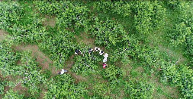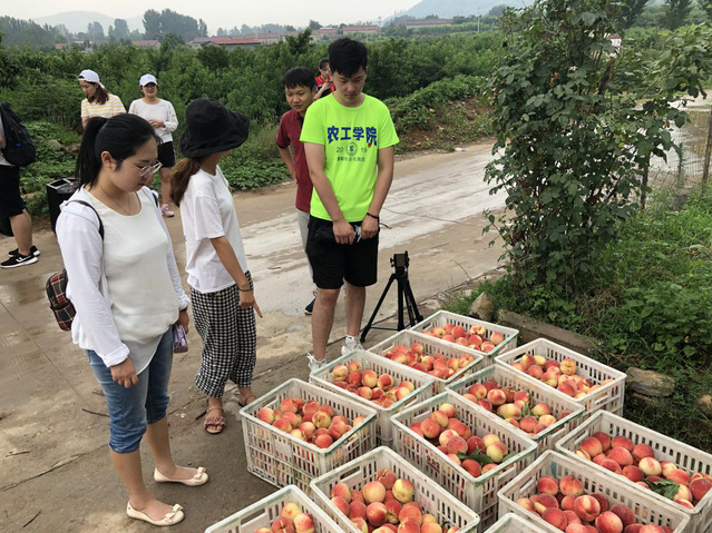 实践队员在桃园里与正在劳作的果农交谈,并和拍摄组利用精灵4航拍无人机对桃园的地貌进行了影像拍摄和分析。岱崮镇总面积180.7平方公里,辖42个行政村,5.3万人,其中,耕地面积5万亩,经济林面积10万亩。蜜桃种植作为当地的支柱产业,桃园管理的机械化程度非常低,从桃树开花时算起,授粉、疏花、疏果、套袋、喷药、收获、灌溉、剪枝、施肥等等环节几乎全部是人工管理,能够使用的小型田园管理机械如小型微耕机、除草机、担架式喷雾机等普及程度不高,另外像人力成本投入最高的套袋环节,目前尚未有实用产品应用。分析机械化程度不高的主要原因,实践队员认为,首先是果树种模式不规范,不利于机械化统一作业;二是地形限制,岱崮镇的果园以坡地和部分平地为主,地形交错出现,果园中还有众多电线杆等;三是种植不成规模和零散分布,据了解,每块地都被分散成不同的小单元,一亩地可能是四五户种植户的果园,因此统一管理难度非常大。