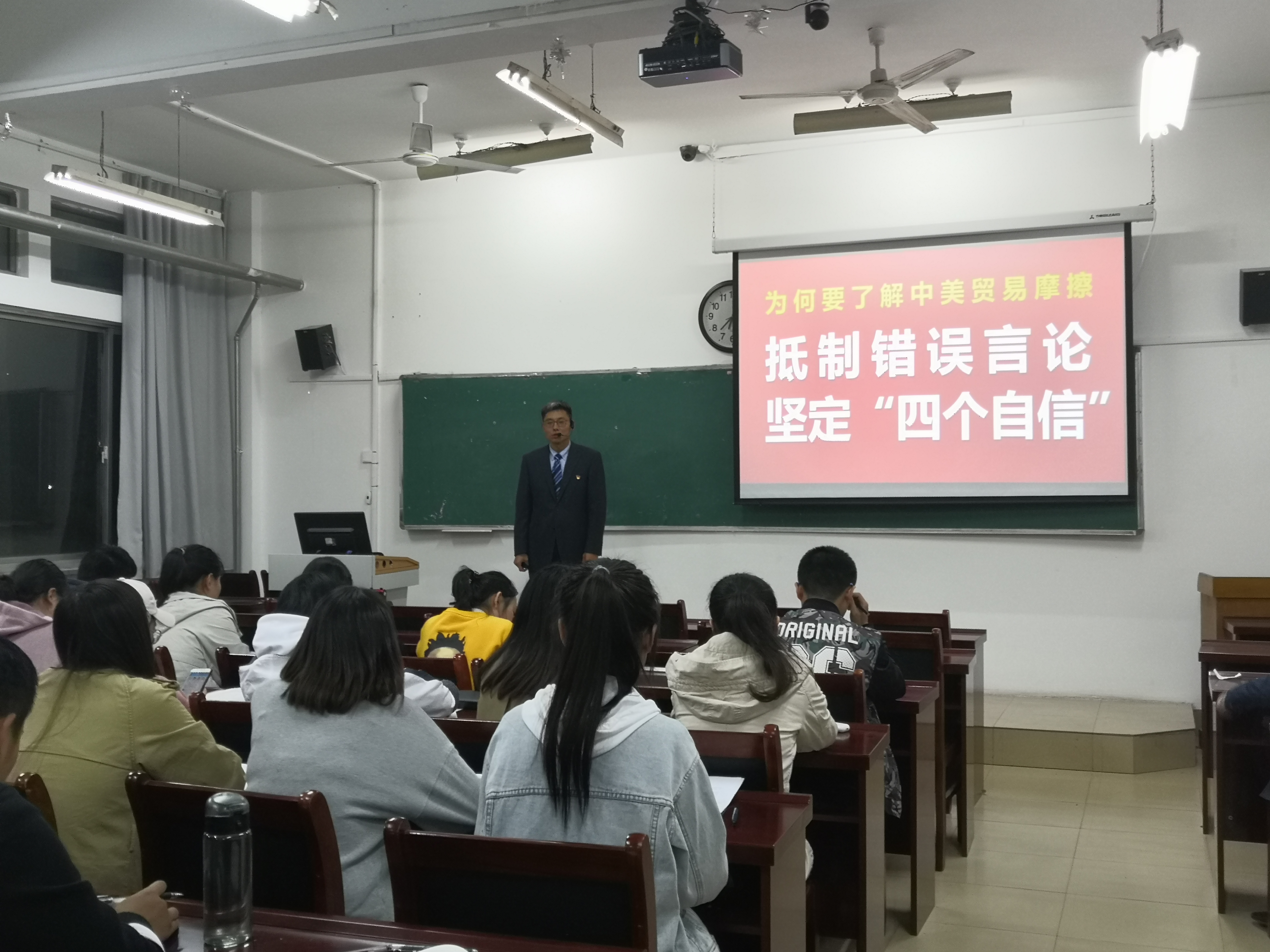会上,岳松首先向大家介绍了为什么要了解中美贸易摩擦,从百年未有之大变局提及决定世界大事的十个基本变量,指出高校学生要正确把握国际形势,树立正确的历史观、大局观、角色观。