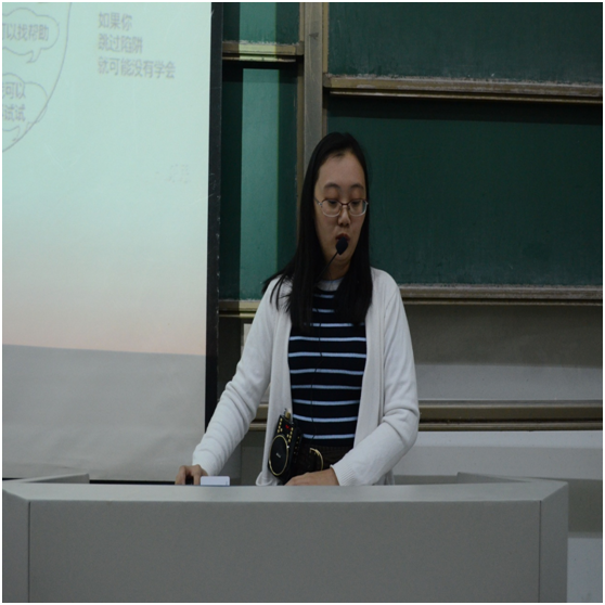 贾晶晶首先问同学们是否了解自己的情况,是否想好毕业之后做什么,紧接着分别就考研、就业和创业三个方面的社会形势以及需要做的准备工作做出详细介绍。她告诫同学们要牢牢抓住大三这一黄金时期,在这一年里要规划好自己未来的人生,清楚自己的目标,并为之不懈奋斗。