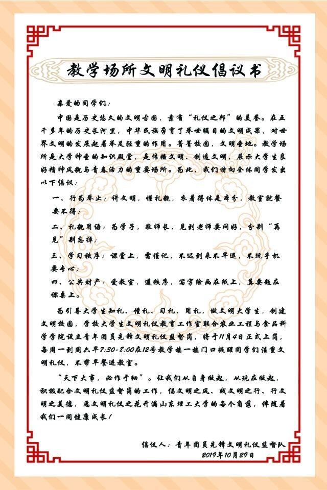 据悉,为让活动有效开展,文明礼仪监督队发布了教学场所文明礼仪倡议书,通过微信公众号、制作海报张贴在12号教学楼等方式进行广泛宣传。倡议书从行为举止、礼貌用语、学习秩序、公共财产四个方面号召学生共同创建文明的教学环境,彰显理工学子的文明素养。