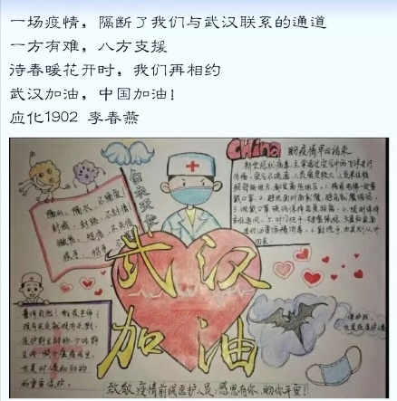 在疫情面前,我们毫不畏惧,每一位同学都对祖国未来充满希望,对武汉成功充满期待。我们相信一线英雄们可以在这次战斗中取得胜利!