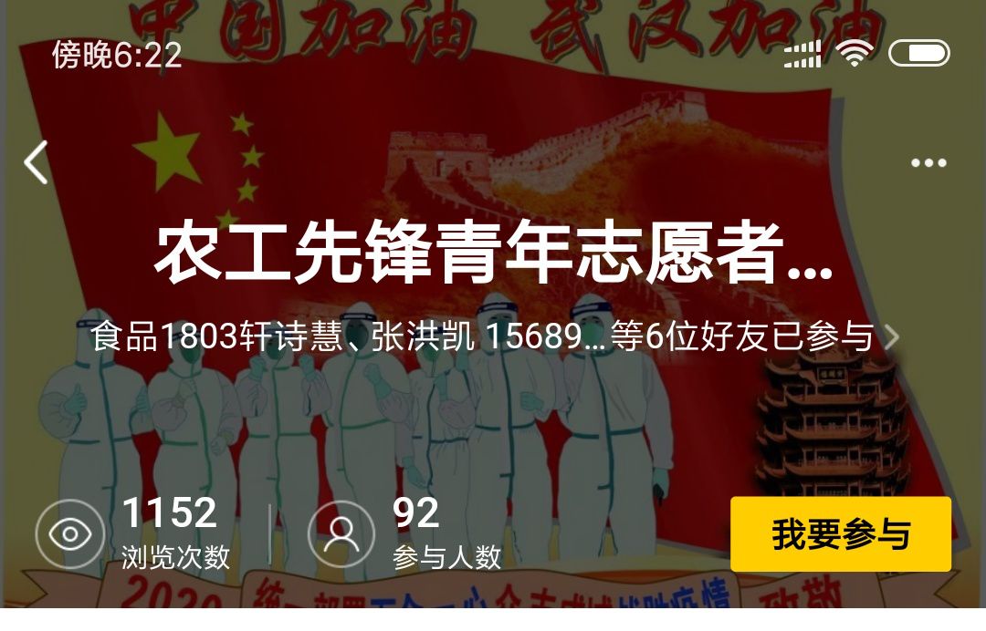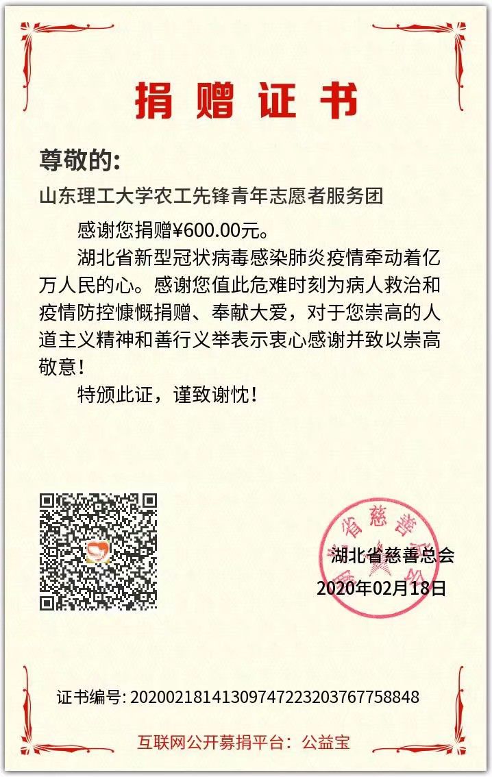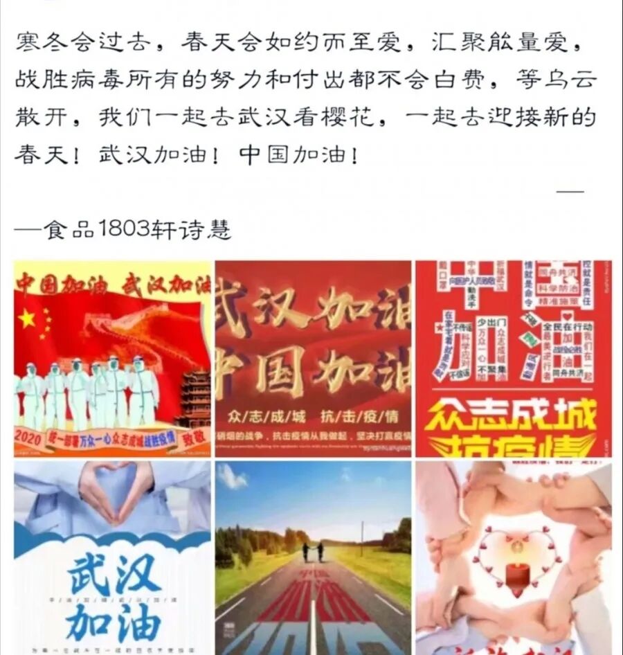 首先,农工先锋志愿团社团成员一致决定于2月28日将由山东理工大学农业工程与食品科学学院颁发的社团奖金600元捐赠给湖北省慈善总会。其次,志愿团在线上发布“声援武汉,声援中国”的活动。活动发布后,同学们积极报名参加,以各式各样的方式参加活动,既有同学为武汉加油写祝福文字,也有同学发挥专业特长创作海报或手抄报,还有同学为武汉、为祖国录制的声援视频。虽然参加活动的方式不同,但目的始终相同,都是为了表达自己对武汉、对祖国的信心与祝福。通过此次活动,我们感受到了每一位同学对祖国的热爱,对战胜病魔的信心以及对一线工作人员的祝福。