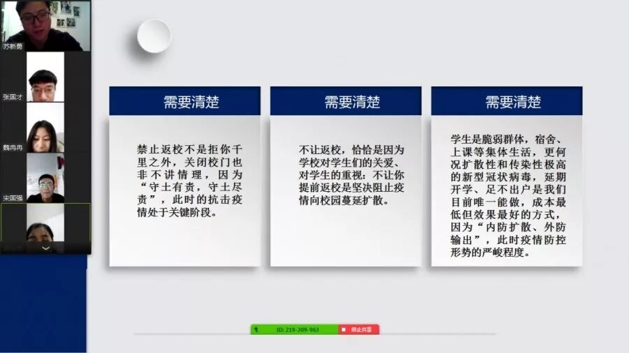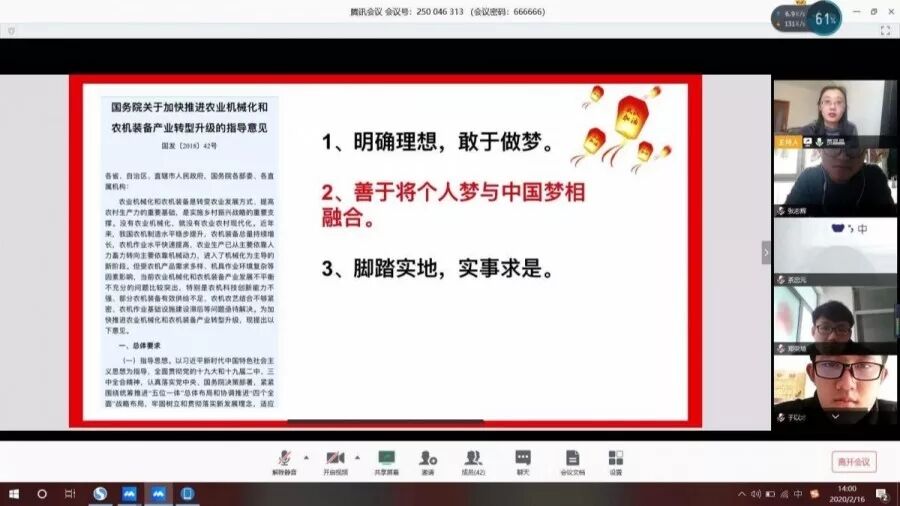 本次“云”班会充分发挥线上实时互动的优势,跨越空间障碍,是农工学院加强抗“疫”时期学生思想政治教育的有益探索,不仅拉近了居家学生与学校的距离,也让学生对新型冠状病毒感染的肺炎有了更深刻的认识,更加坚定了同学们抗击疫情的信心。