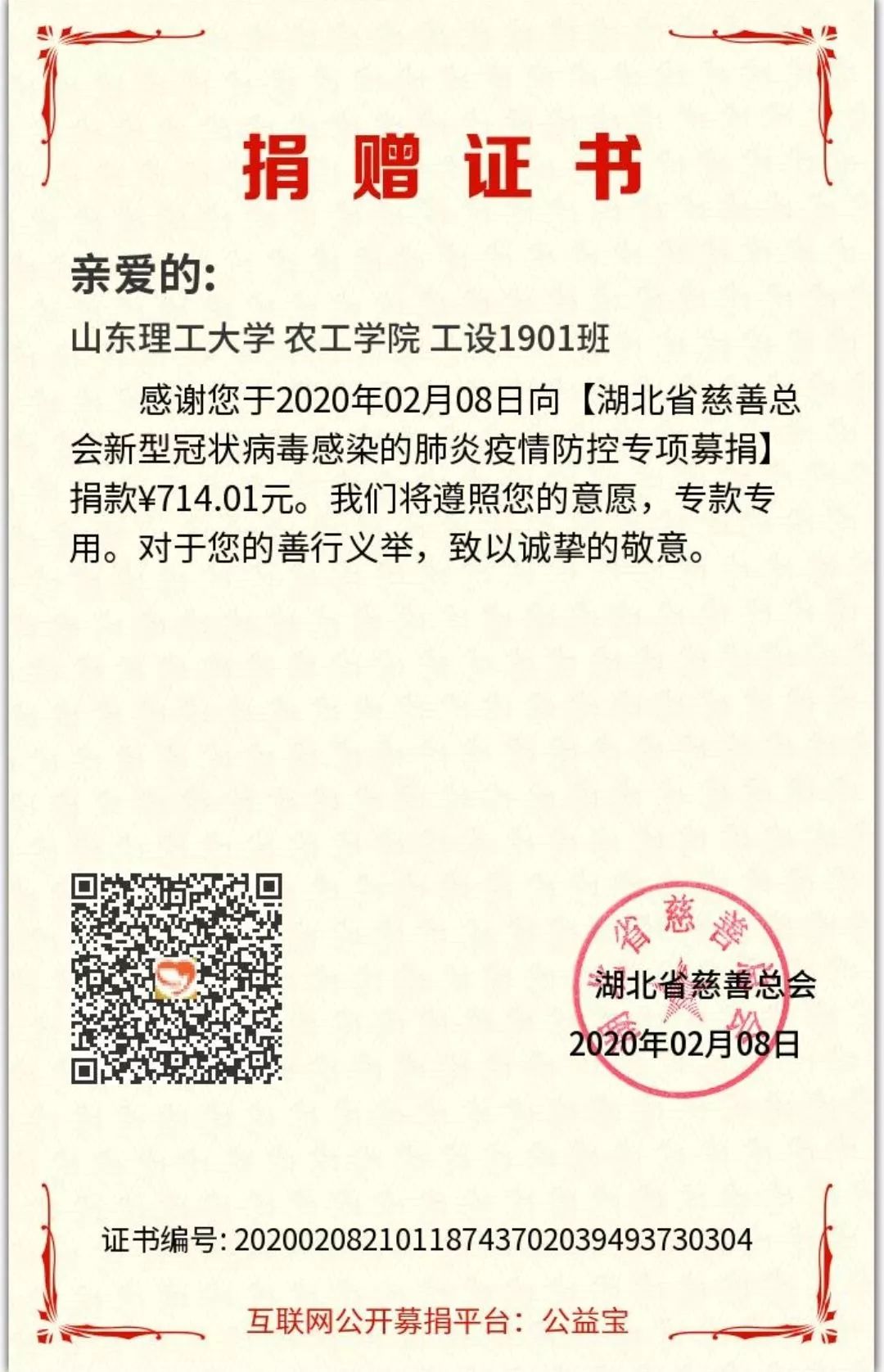 工设1901班组织了“天佑中华,力援武汉”募捐活动,筹集共计714.01元善款,并以“山东理工大学农工学院工设1901班”的名义全部捐赠给湖北省慈善总会。