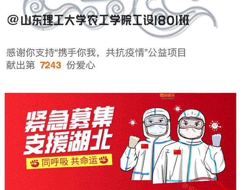 工设1902班,在班级范围发起了“武汉加油、我为武汉献爱心”捐款活动,募集了435.23元善款,以“山东理工大学农业工程与食品科学学院工业设计1902”的名义于2月9日捐赠湖北省慈善总会。