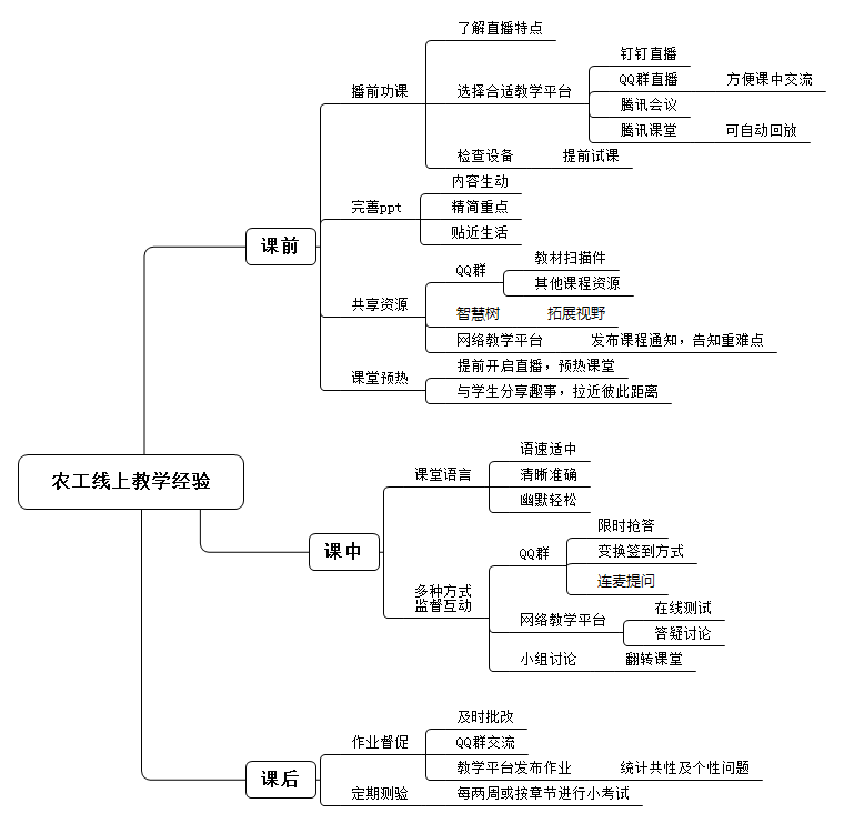 食品系张妍妍老师谈到,“线上教学互动少,无法直观看到学生,且学生久盯屏幕容易产生疲惫感、易走神,因此完善的课前准备与演练是线上教学的重要环节”。所以在制作课件时,要提炼教学要点,明确重难点,简化知识点,减少课程容量,并在开课前进行课程演练,疏通章节要点,严格把控时间。
