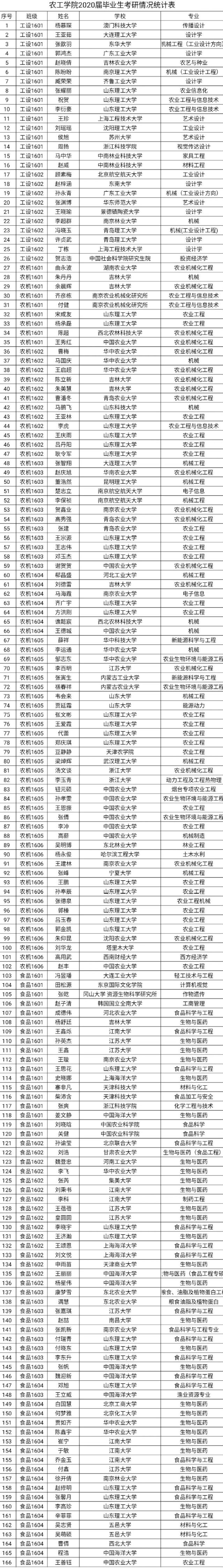 2020年研究生录取工作尘埃落定,农业工程与食品科学学院2020届本科毕业生考研再创佳绩,2016级429名毕业生中166人被浙江大学、中国农业大学、北京航空航天大学、山东大学、江南大学、吉林大学等高校及科研院所录取,其中保研5人,考研录取158人,出国读研3人,学院本科毕业生总体考研率为38.7%。