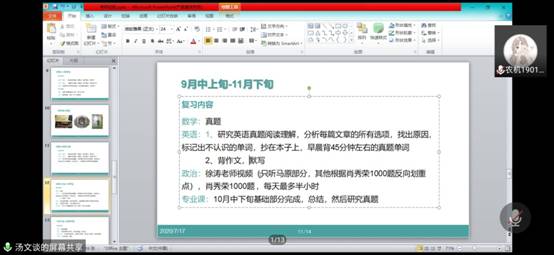 随即,汤文谈通过个人简介、考研各阶段安排、考研心得三个部分分享自己考研优势以及备研过程中遇到的问题、解决方法。她强调:真题是最好的复习资料。考研是对自己所学知识的考验,复习过程中要多做真题,了解题目特点,结合知识归纳,这样才能在考试过程中胸有成竹。