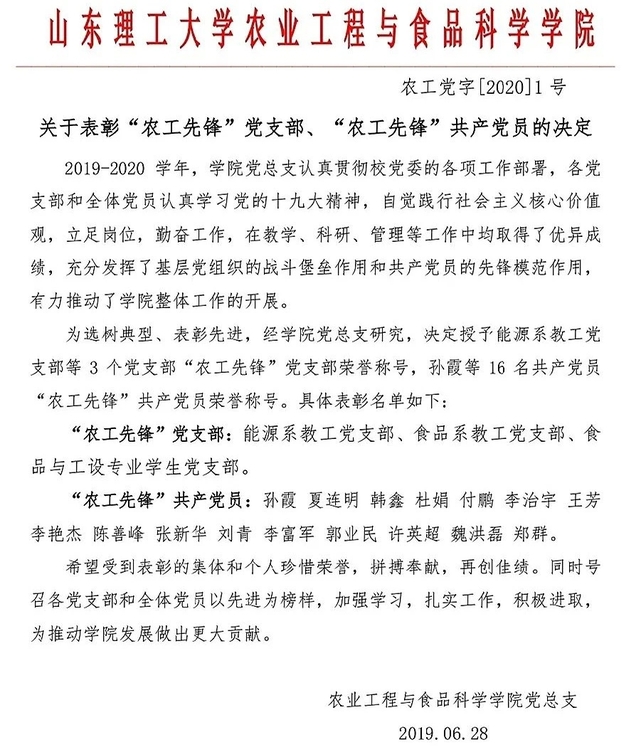 关于表彰“农工先锋”党支部、“农工先锋”共产党员的决定
