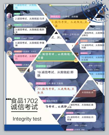 随着时间的流逝,期末考试也渐渐接近尾声。食品1702班团支部为使“诚信考试”意识贯穿考试始终,于6月29日以团小组为主,组织同学们继续深入了解考试要求,团支部全体成员在班级群接龙表明态度,表示诚信考试将从自身做起。
