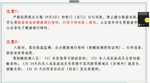 会上,各辅导员就秋季开学返校安排、学生返校条件、返校前准备工作、返校途中自我保护以及返校后日常防护都做了细致的介绍。会后,就学生比较关心的返校后学习、生活等方面的疑问,辅导员们都一一做了解释。