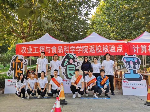 学院辅导员和志愿者提前抵达报到现场,精心准备“农”“食”“工”表情包迎接返校同学,返校学生纷纷和本专业表情包合影留念。