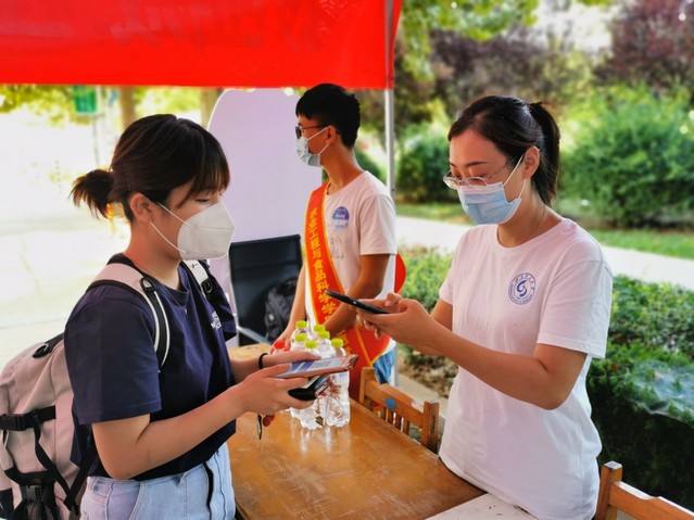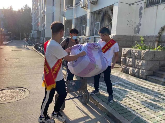 令人感动的是,在返校现场的志愿者是一道亮丽的风景线,甚至很多志愿者都是刚刚返校的学生,放下行李立即加入到志愿者的行列中。他们身披红色绶带,在校门帮助返校生运输行李,介绍如何出示身份与健康证明,来回奔波于楼层宿舍之间,微笑伫立于骄阳之下。