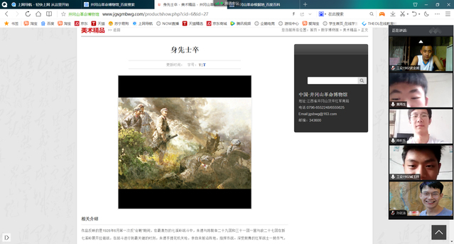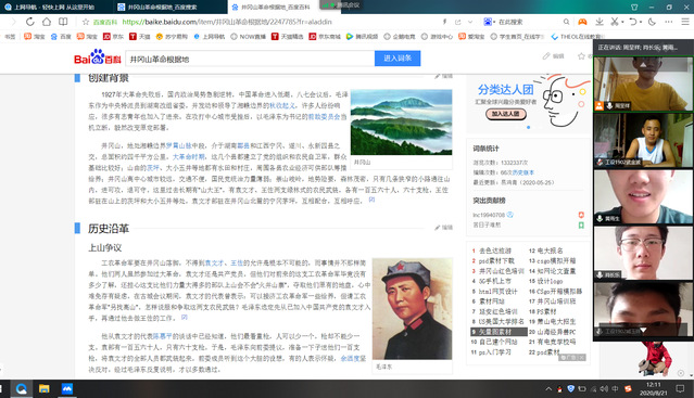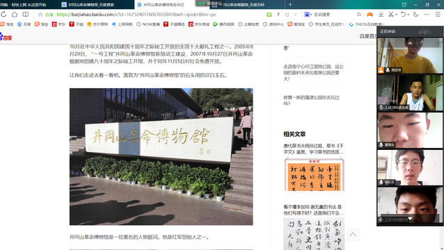 线上实践过程中,由实践团队长周呈祥在百度网页搜索井冈山革命历史纪念馆,团队成员通过共享屏幕一同观看纪念馆,感受它的历史,并发表感悟。紧接着,由队长周呈祥向大家介绍井冈山的革命,井冈山革命根据地的建立,点燃了“工农武装割据”的星星之火,为中国革命的中心工作完成从城市到农村的伟大战略转移,走上农村包围城市,武装夺取政权,开辟了新的道路。