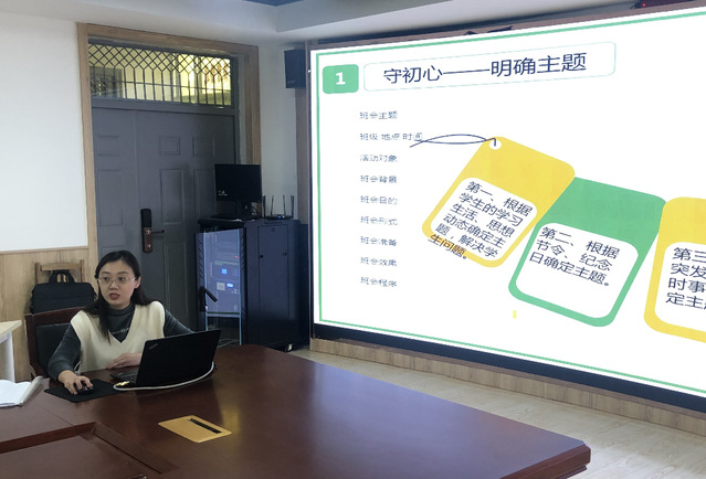 围绕如何开好主题班会,贾晶晶从班会选题、内容设计、形式创新及口头表达能力训练等方面就如何开好主题班会分享学习经验。