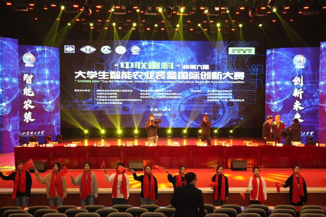 飞天铺展的鲜艳五星红旗、悠扬恢弘的赞美祖国颂歌、华丽跳动的齐鲁鼓子秧舞、宏毅阔远的传统民乐合奏……12月19日,“中联重科”杯第六届大学生智能农业装备国际创新大赛决赛在山东理工大学隆重举行。中国工程院陈学庚院士、赵春江院士、中国农业机械学会理事长王博、山东理工大学党委副书记、校长胡兴禹、嘉应学院校长、中国农业机械学会副理事长杨洲、江苏大学党委副书记李洪波、天津农学院副校长赵辉、中联农业机械股份有限公司党委副书记胡显清、山东理工大学党委常委、副校长易维明、江苏大学农业装备学部执行主任毛罕平、山东省农业农村厅农机化管理处调研员辛章法、中国农业机械学会秘书长张咸胜、中国农业工程学会执行秘书长王应宽、中国农业机械流通协会秘书长如一等出席活动,参加大赛的还有农机领域知名专家教授、企业代表、各参赛高校师生代表等共计1000余人。本届大赛以“智能农装、创新未来”为主题,由国际农业和生物系统工程委员会、中国农业机械学会、中国农业工程学会、江苏省现代农业装备与技术协同创新中心、农业工程大学国际联盟主办,山东理工大学承办,中联重科股份有限公司冠名。