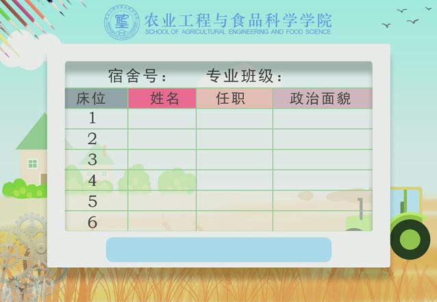 本次大赛共征集到作品58件,每一件作品各有特色,集中体现了同学们严谨认真的态度,表达了同学们热爱学院的情怀。经过初筛、复评、终评三个环节,确定了最终的录用稿件。该稿件设计简洁大方,以智慧农场的秋收景象为底色,前置涵盖宿舍号、专业班级、宿舍成员姓名、任职以及政治面貌的信息表格,既应宿舍实用之需,又突出了我院专业特色,获得了一致好评。目前,我院本科生宿舍门牌均已张贴完毕。