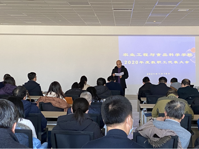 会议在庄严的国歌声中正式开幕。执行院长李志合作《农业工程与食品科学学院工作报告》,李志合院长总结2020年学院取得的重大进步与突破。李院长表示,学院以“一个目标,两个一切,三个愿望,四个突破”的工作理念为指导,在人才培养、师资队伍建设、研究生培养、科研与社会服务等方面均取得了较大的进步,在农业工程一流学科、农机国家一流专业、食品科学与工程博士点申报、第五轮学科评估等重点工作中取得新的突破。这是学院所有教职工认真工作、无私奉献的成果,也希望各位老师能够再接再厉,2021再创佳绩。