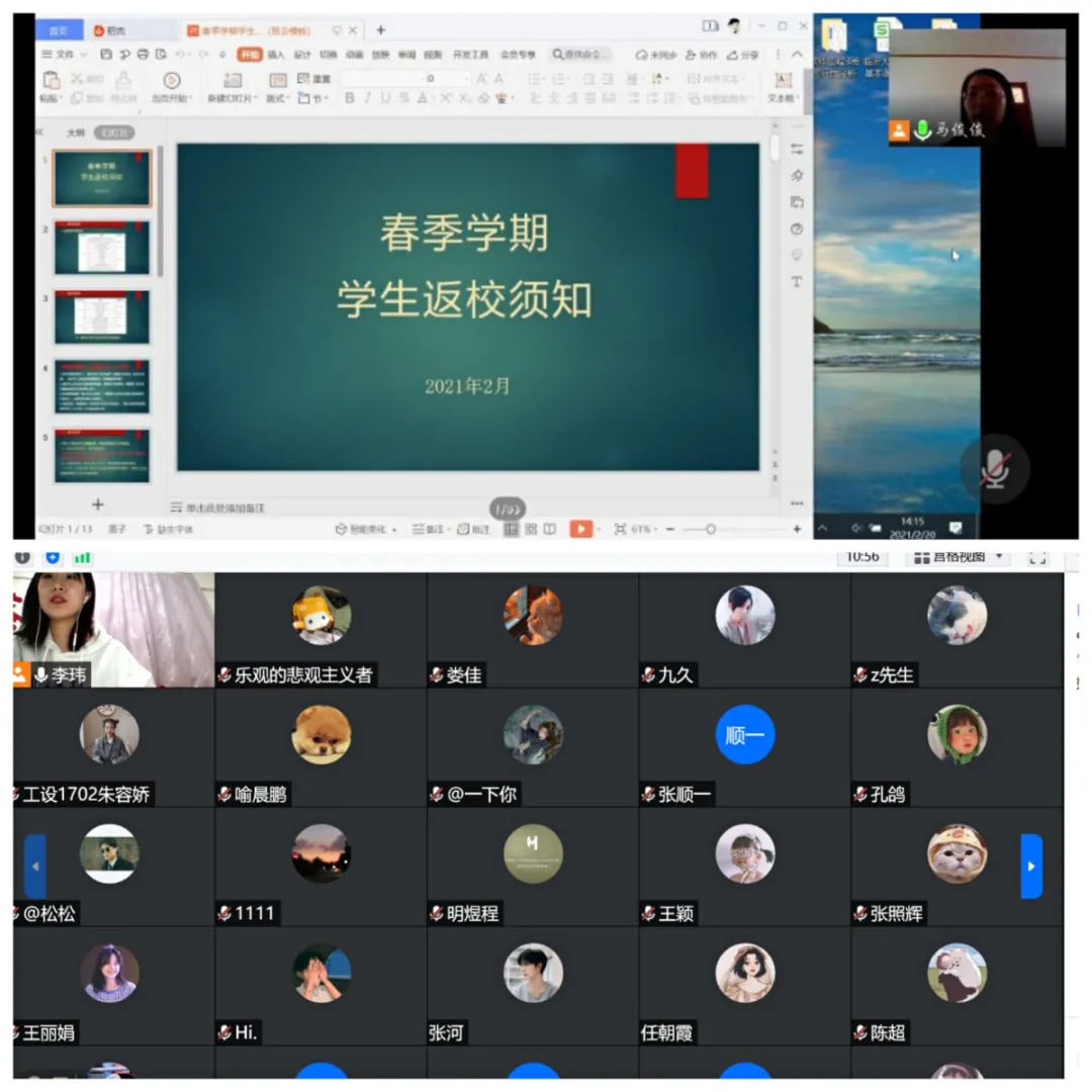 各年级辅导员还就返校当天注意事项进行了详细讲解。提醒同学们严格按照错时错峰要求在规定时间、指定校门进入校园,入校时提前准备好学生证、返校二维码、健康码及行程卡等材料以备核验。辅导员还对校内摆渡车辆、行李接运、志愿者服务等学生关切的问题开展了线上交流,叮嘱同学们如遇特殊情况或困难应及时与老师沟通求助,学校及学院将全力为学生顺利返校提供便捷服务。
