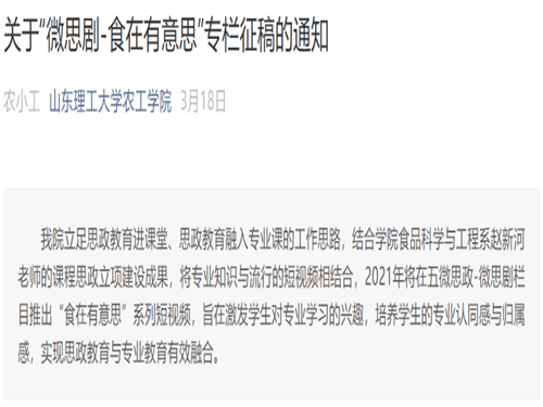 在“食在有意思”活动中,立足思政教育进课堂、思政教育融入专业课的工作思路,结合该项目的建设成果,将专业知识与流行的短视频相结合,2021年将在五微思政-微思剧栏目推出“食在有意思”系列短视频,旨在激发学生对专业学习的兴趣,培养学生的专业认同感与归属感,实现思政教育与专业教育有效融合。该活动要求视频必须融入“食品”领域相关知识,内容必须健康积极向上,视频尽量诙谐幽默,有效促进其传播宣传。实践发现,同学们能够积极的参与,并提供高质量的作品。