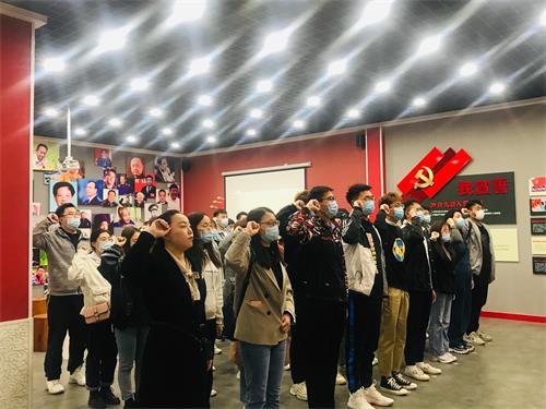 活动伊始,支部书记为学生党员佩戴党徽。随后,讲解员详细地为全体党员介绍了马克思主义的诞生历史、党章的修正、党章的内容等方面知识,并一一讲解了雷锋、焦裕禄、黄大年、廖俊波等优秀党员的事迹,激励全体党员要努力向榜样看齐,学习榜样的精神。在讲解员的带领下,全体党员观看了视频《我宣誓》,重温入党誓词,重燃入党热情。在入党誓词墙前,全体学生党员举起右拳,庄严地宣誓。一阵阵铿锵有力的宣誓声,既展现出了青年学子的朝气蓬勃,也彰显了全体学生党员对党的忠诚和拥护。
