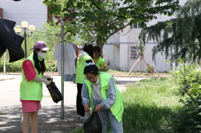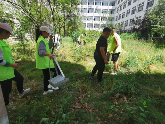他们身穿荧光绿志愿者马甲,在校园里奔走,为保护学校环境做出一份贡献。他们挽起袖子,手持工具垃圾袋,还有人徒手捡拾垃圾。他们不怕脏、不怕苦,将草丛里、教学楼边、路边垃圾清理干净。每个成员都认真参与,炎炎夏日下,汗水挥洒在校园里。