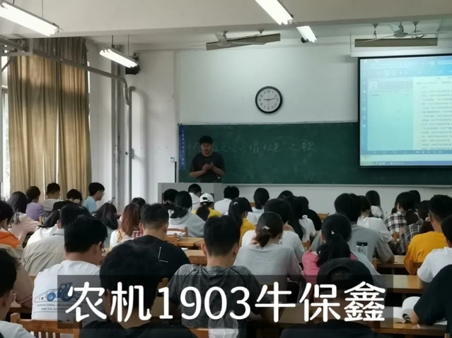活动伊始,刘保月简要介绍了活动流程,宣布活动开始,随后,来自农机1903班牛保鑫和食品2001班李迎雨的两名代表领唱《没有共产党就没有新中国》,逐字逐句进行现场教唱。