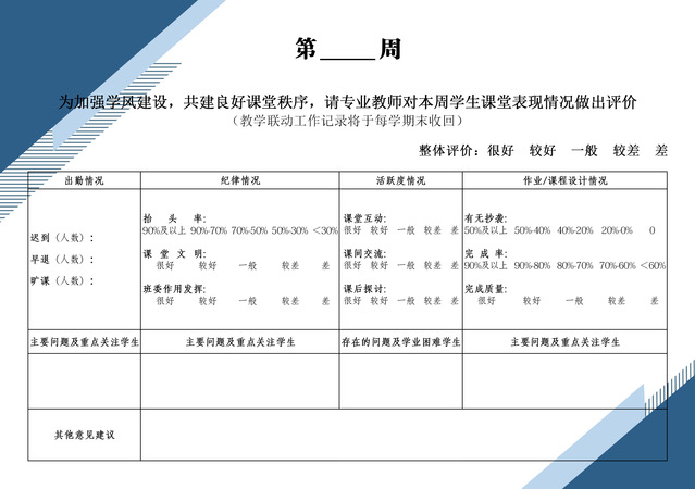 为贯彻落实我院《学风建设专项行动计划》,培育优良学风,优化育人氛围,培养“五有人才”。2021年4月,我院设计《教学联动工作记录》,由辅导员走进课堂,发给任课教师,构建辅导员与专业教师联动机制以实现教学联动延伸专项行动。
