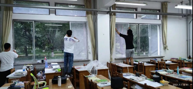 自党史学习教育开展以来,学生公寓党团服务中心党员始终坚持将学习党史同总结经验、服务师生结合起来,采取走访、调研等多种形式了解师生需求,扎实开展“办成一件实事好事”实践活动,坚持把好事办实,把实事办好,让学生党员走到哪里,党徽就闪耀在哪里。在走访中,党员同志们了解到夏季蚊虫增多,影响了同学们在教室的学习、生活。于是,党员们自发为学院考研自习室制作、安装纱窗。他们提前实地考察,测量窗户尺寸及数量,根据尺寸大小购置纱网、贴纸,制作纱窗。为不打扰考研学子的正常学习,学生党员们于下午就餐时间开展安装工作,在保证安全的前提下高效安装好纱网。安置工作结束后,学生党员自觉打扫卫生,迅速将现场清理干净。