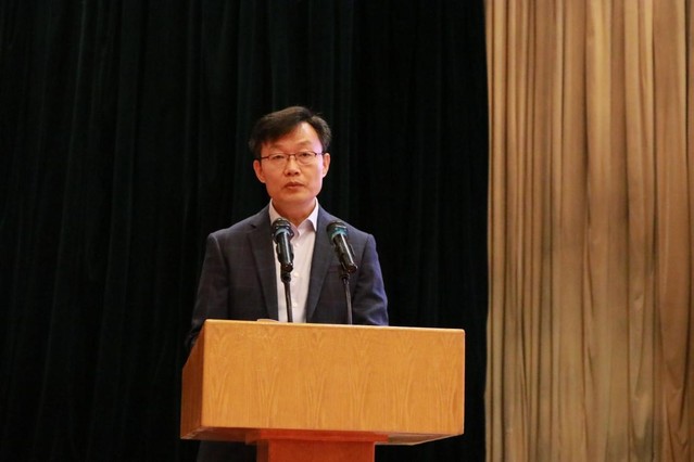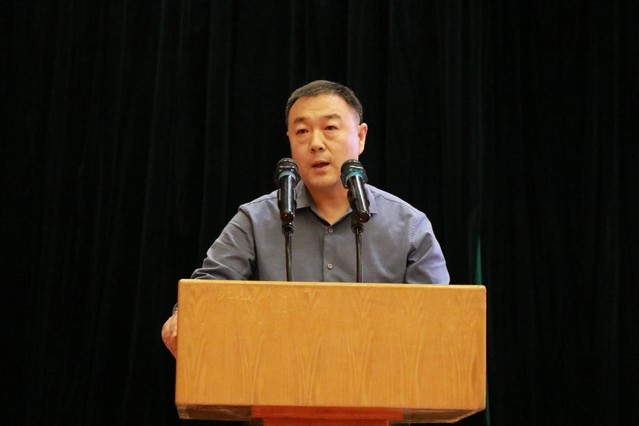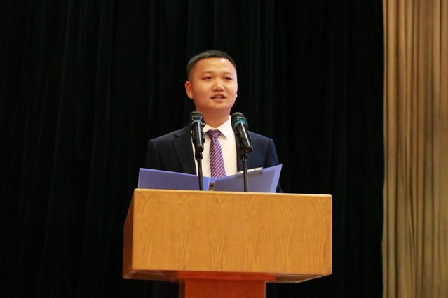 教师代表陈善峰教授发言。陈教授从尽快完成角色的转型、尽早制定合理的规划、成为一个读书人三个方面给即将开启大学之旅的新同学们提出建议,他勉励同学们作为熠熠生辉的山理之光、国家的未来和民族的希望、中华民族伟大复兴的智慧和力量,在探求真理的道路上,要自觉肩负起时代赋予的重任。