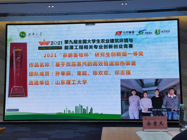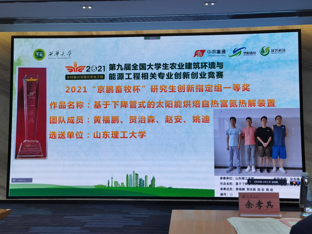 10月27日,第九届全国大学生农业建筑环境与能源工程相关专业创新创业竞赛(简称农建创新创业竞赛)在成都西华大学成功举办,我院遴选推荐的5个项目代表学校参加了比赛。最终,蔡红珍教授指导的《基于负压蒸汽的高效恒温加热装置》项目、毕冬梅副教授指导的《基于下降管式的太阳能烘焙自热富氮热解装置》项目荣获全国一等奖,另外2个项目荣获全国二等奖,1个项目荣获全国三等奖。同时,我校被授予为“最佳组织奖”。