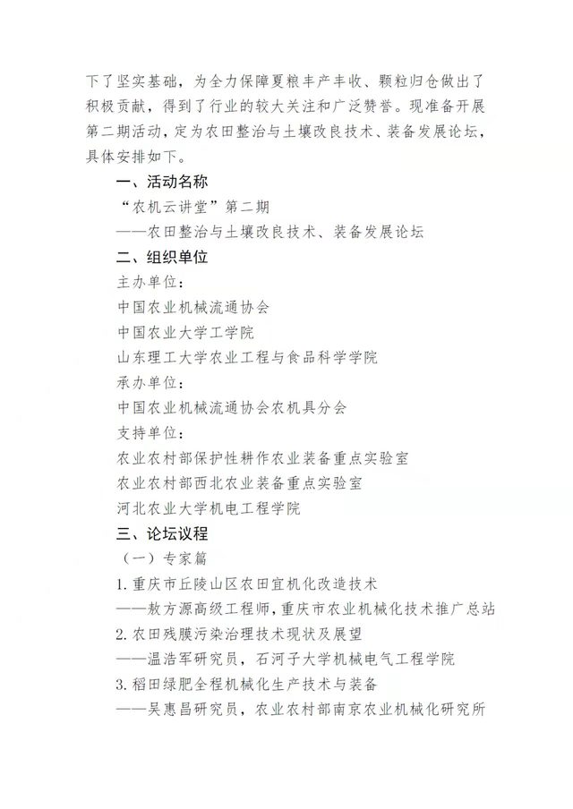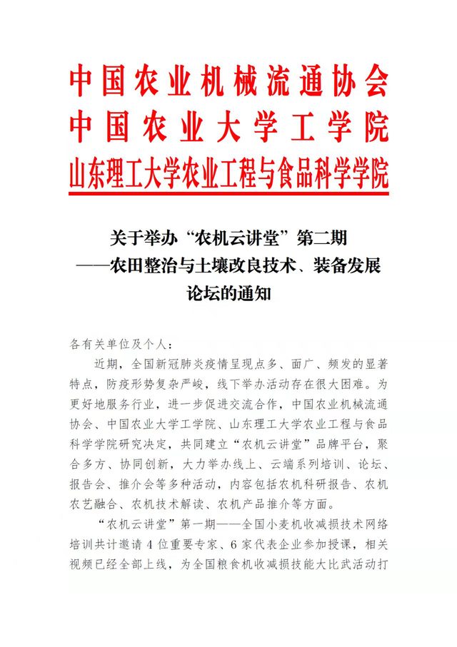 关于举办“农机云讲堂”第二期——农田整治与土壤改良技术、装备发展论坛的通知