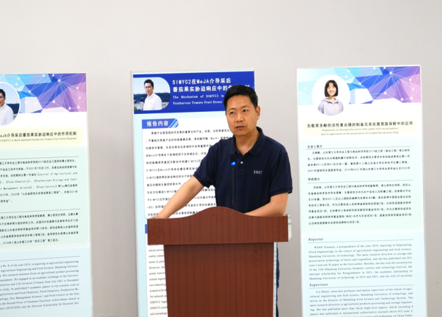 宋元达教授依次向与会人员介绍了本场报告会的主讲人及其汇报内容,博士研究生闵德栋,硕士研究生王晓敏、黄靖程、周肖楠分别作了题为“SlMYC2在MeJA介导采后番茄果实胁迫响应中的作用机制”、“负载茶多酚的活性复合膜的制备及其在鹿茸菇保鲜中的应用”、“双金属纳米材料生物传感器的构建及其在蔬菜中农药多残留检测的应用”、“白菜废弃物混菌厌氧发酵产己酸研究”的学术报告。