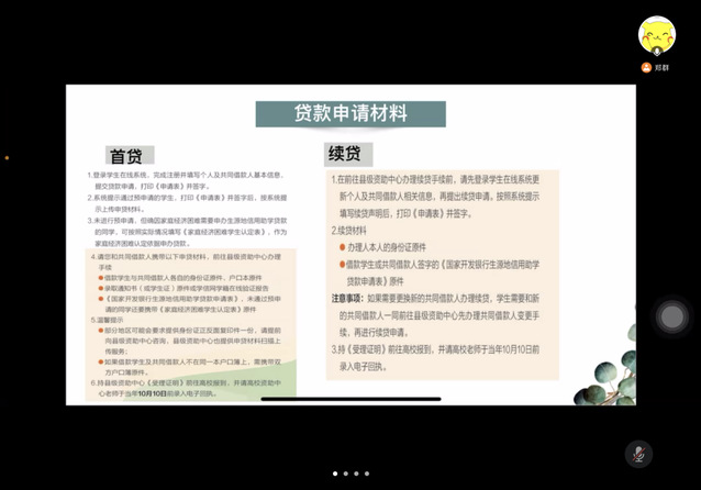 5月25日,我院“信用助学贷款,感恩社会还贷”主题报告会通过腾讯会议线上举行。此次会议由郑群老师主讲,学院各年级已申请助学贷款及有意向申请助学贷款的学生参加。