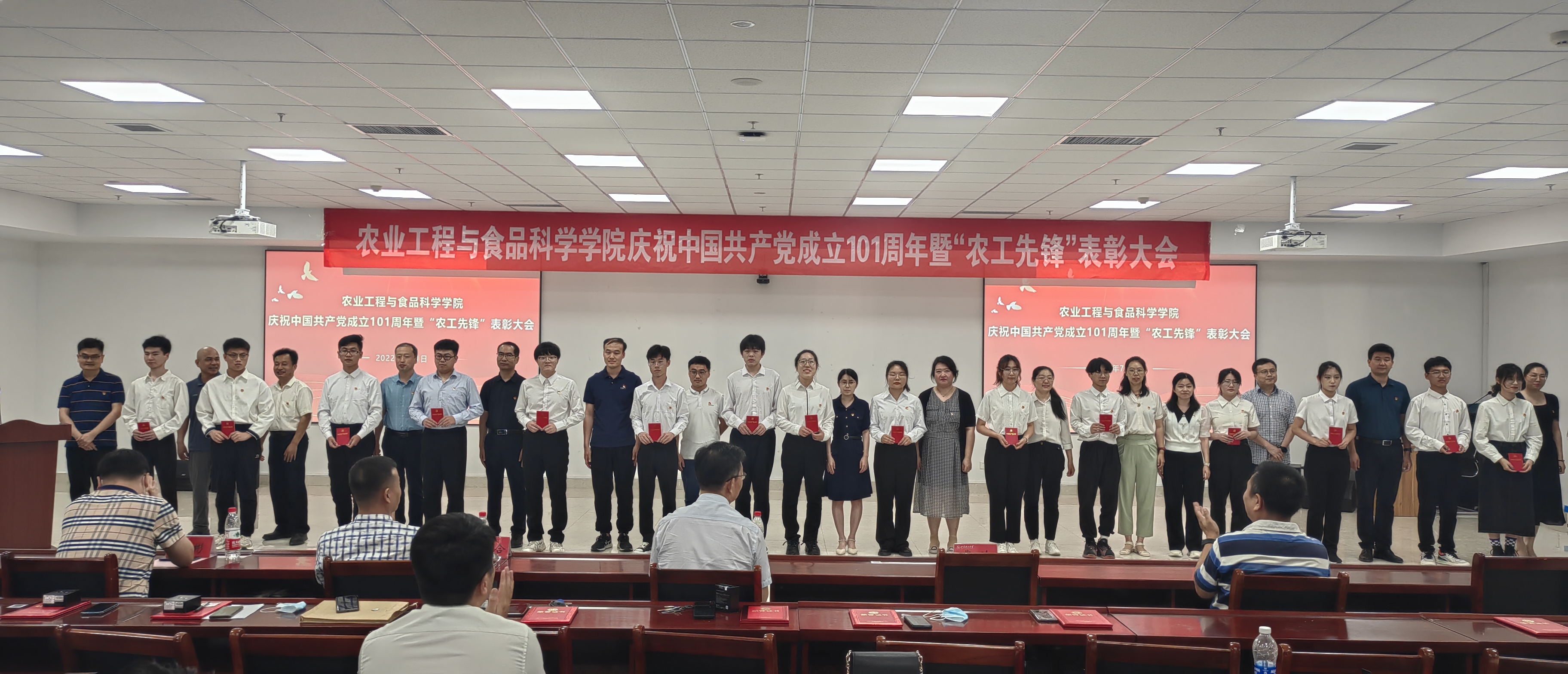 为热烈庆祝中国共产党成立101周年,表彰先进,激励广大党员以更饱满的热情、更务实的作风、更有力的举措,积极投身教育事业,以优异成绩迎接党的二十大召开,7月1日,我院在6号实验楼报告厅召开庆祝中国共产党成立101周年暨“农工先锋”表彰大会。学院领导班子成员、全体教师党员、学生党员代表等参会。学院党委副书记戴洁主持会议。