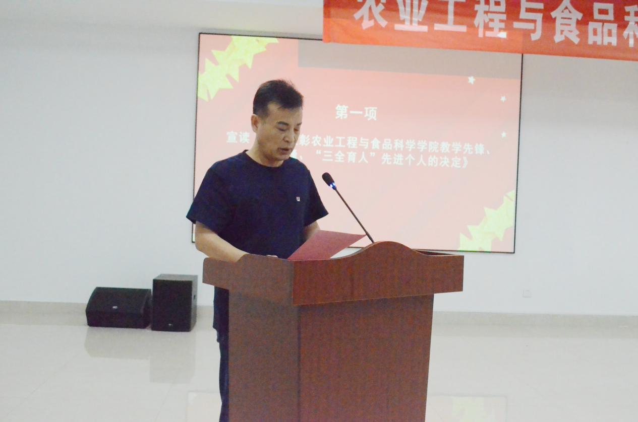 学院执行院长李志合宣读了《关于表彰农业工程与食品科学学院教学先锋、科研先锋、“三全育人”先进个人的决定》,授予王伯龙等10人“教学先锋”荣誉称号,授予刁培松等10人“科研先锋”荣誉称号,授予肖洋等10人“三全育人”先进个人荣誉称号。同时发布并解读《农业工程与食品科学学院本科生导师制实施办法》。