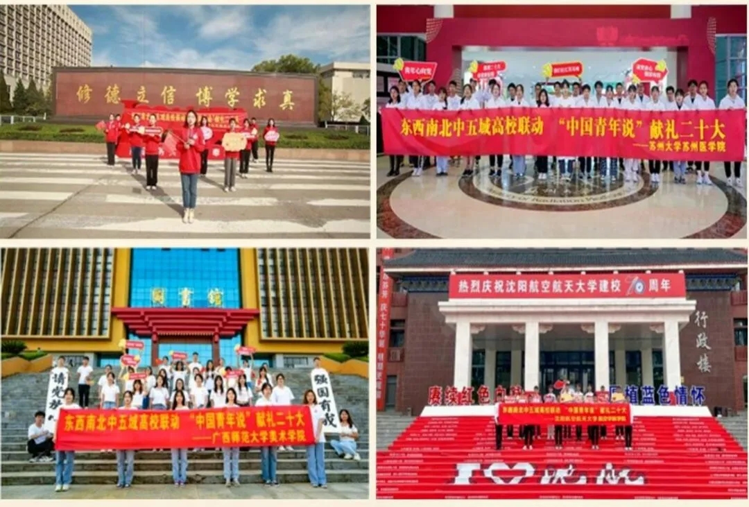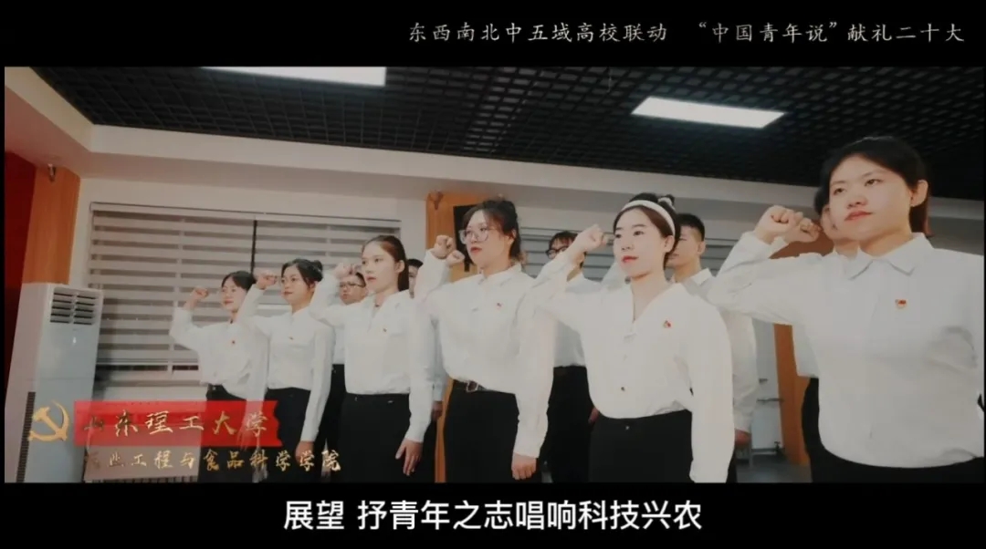 为庆祝党的二十大胜利召开,山东理工大学农业工程与食品科学学院联合山西财经大学马克思主义学院、苏州大学苏州医学院、广西师范大学美术学院、沈阳航空航天大学航空宇航学院,以网络连线方式,实现了一次跨越千里的云端联动,以中国青年亲身所学所知、所见所感,从理论自信、科技兴农、健康中国、美丽世界、航天逐梦等角度,述说党的十八大以来中国非凡十年的辉煌成就,一颗颗向党而生的“种子”立下铮铮誓言,“中国青年说”献礼二十大。