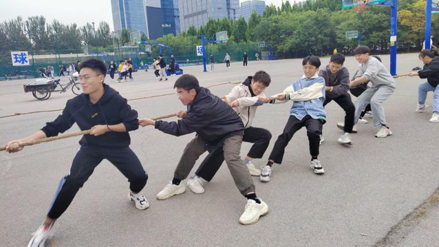 此次趣味活动共分为八字跳绳比赛和拔河比赛两部分,均以班级为单位,以抽签的形式确定对弈双方。首先进行的是八字跳绳比赛,14支参赛队伍依次上场,参赛队员团结一心、步调一致,赛场上队员们齐心协力,赛场下,各班同学的呐喊加油声此起彼伏,场上的氛围也逐渐推向高潮。