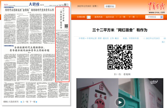 【导读】2022年12月20日,继中青报客户端报道后,《中国青年报》第3版“大思政周刊”以《三十二平方米“网红宿舍”有作为》为题又深度报道了农业工程与食品科学学院在学生公寓里建设的党团服务中心。