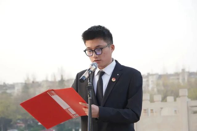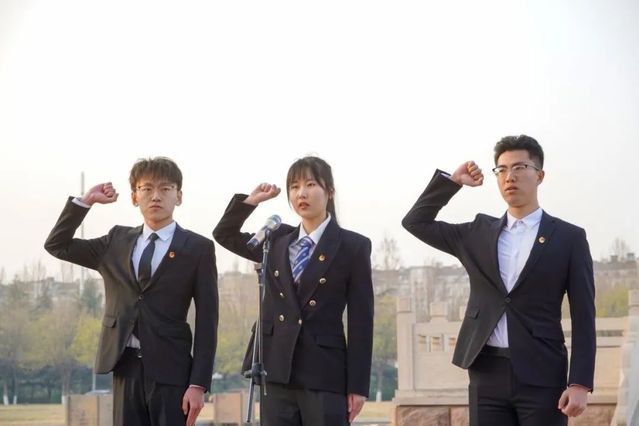 青年学生代表李子强、陈佳慧、张敬卓带领全体学生重温入团誓词,在国旗下庄严宣誓。