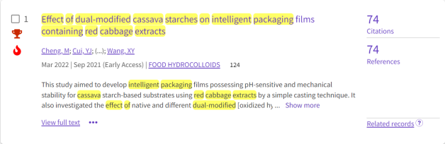 根据ESI(Essential Science Indicators)2023年11月公布的最新统计数据,我院王相友教授团队程萌博士生发表在国际食品顶级期刊《Food Hydrocolloids》(中科院一区Top,IF=11.504)上的论文“Effect of dual-modified cassava starches on intelligent packaging films containing red cabbage extracts”(2022, 124: 107225)同时入选ESI热点论文(Top 0.1% Hot Paper)和高被引论文(Top 1% Highly Cited Paper)。同年3月,发表在国际期刊《Journal of Food Engineering》(中科院一区Top,IF=6.203)上的论文“An eco-friendly film of pH-responsive indicators for smart packaging”(2022, 321: 110943)也入选ESI高被引论文。