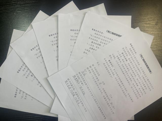 沙龙由“死亡咖啡馆调查问卷”引入,对“假设你现在剩下的日子不多了,你有什么遗憾或者特别想要完成的一件事?”“留给这个世界的一句话”“你真正放不下的是什么”等10个问题进行深入思考与谈论,引导参与者结合个人经历、所见所闻、家族习俗等,分享自己的所感所想,打破禁忌,正视死亡,感悟生命真谛。