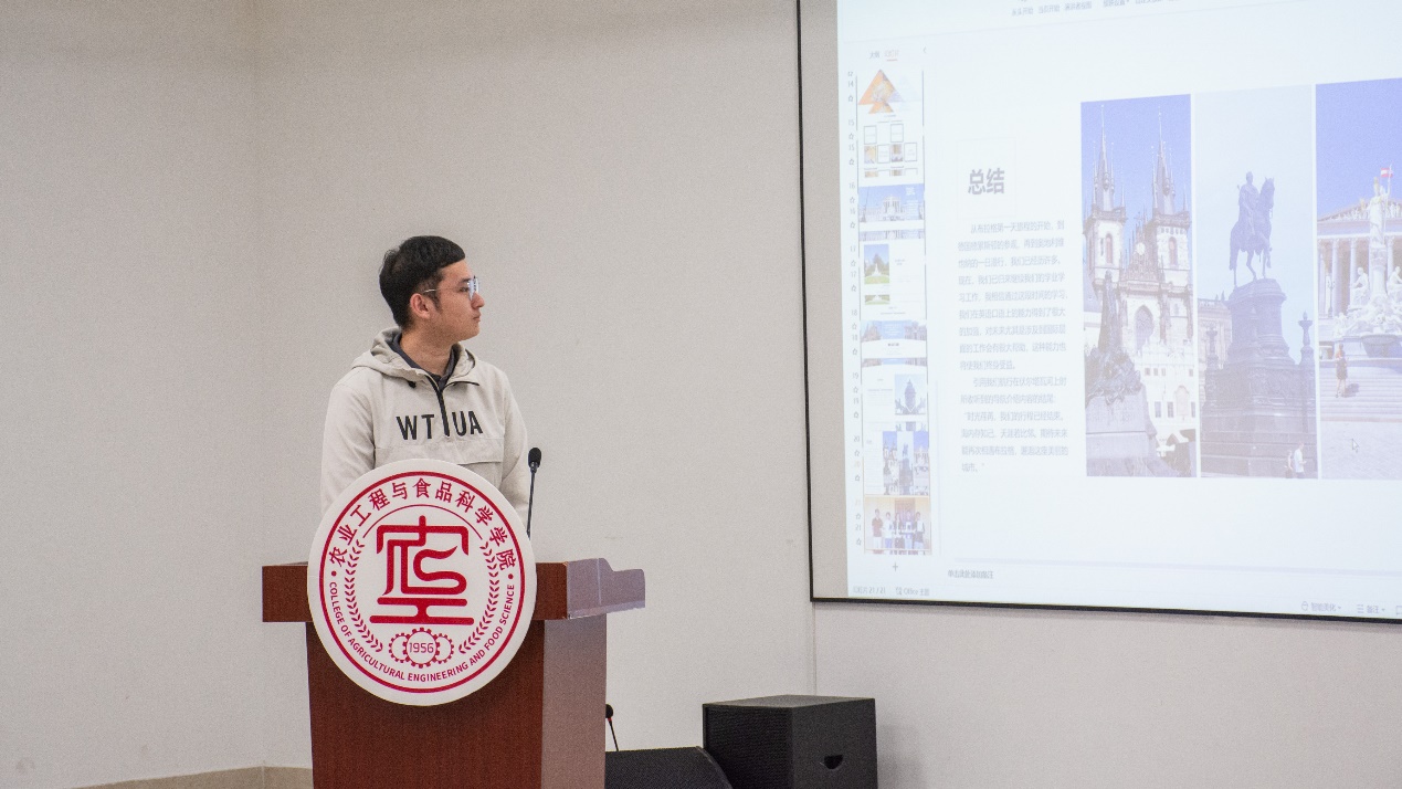 余启运、高萌、曾旭阳、唐俊祥作为访学代表向同学们分享了暑期在捷克查理大学的访学经历。四位同学以生生动丰富的影像材料,讲述了在捷克的学习和文化差异体验、人文交流、探索成长、生活趣事等内容。参加访学的同学不仅提升了英语水平和专业认识,还切身感受了不同国家的多元文化魅力。