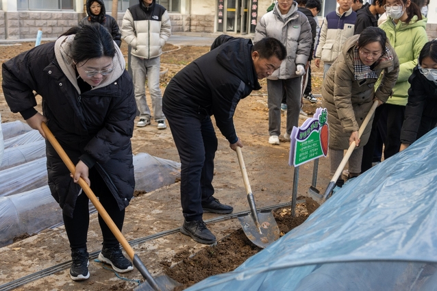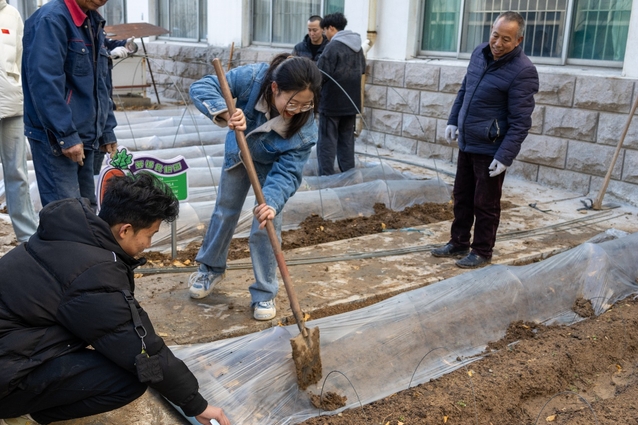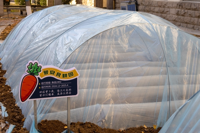 在专业人员的指导下,同学们以班级为单位依次开展松土、起垄、播种、洒水、覆膜、搭棚等,经过五个小时的共同劳作,大家搭建起了胡萝卜大棚,为新栽种的胡萝卜盖上“棉被”。