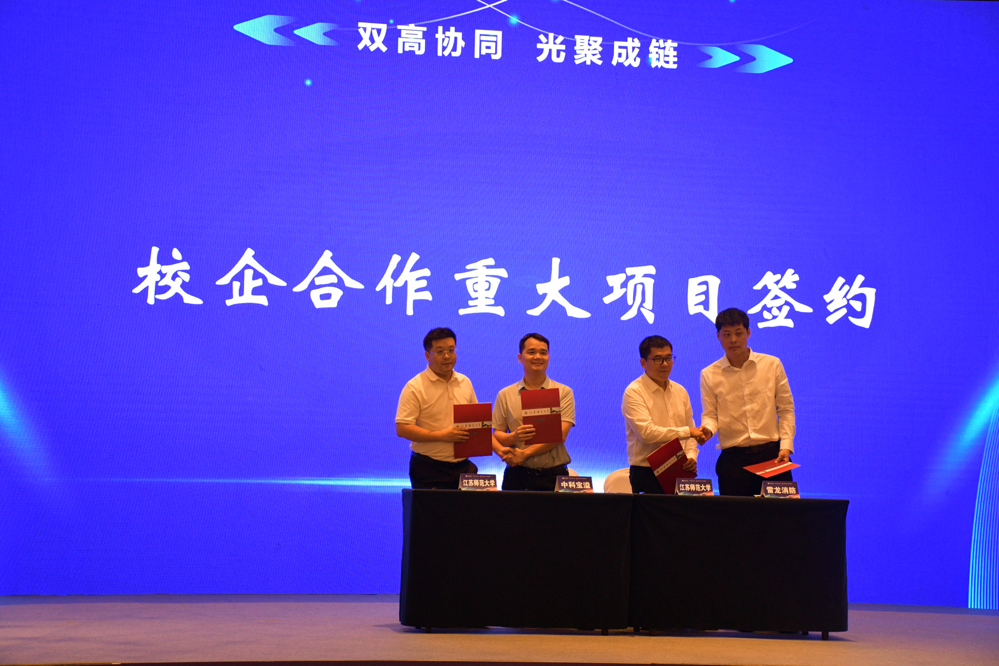 会上,江苏高校成果和铜山区(徐州高新区)企业技术需求正式发布,为产学研合作提供了明确的方向和对接点。徐州高新区与我校举行了江苏省先进激光技术与新兴产业协同创新中心共建签约仪式。江苏曙光光电有限公司、南京波长光电科技股份有限公司、中科宝溢视觉科技(江苏)有限公司、江苏雷龙安全消防器材有限公司等分别与物电学院教师进行了校企合作重大项目签约。