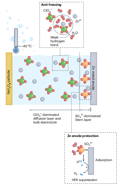 针对这一挑战,文章评述了澳大利亚阿德莱德大学郭再萍院士、张仕林研究员团队提出的"解耦双盐电解液"创新设计策略(图2)。该方案通过在同一水系电解液体系中引入功能互补的两种锌盐,实现了“界面稳定-体相传输”的协同优化:一方面,强水合阴离子可在电极界面构筑致密保护层,有效抑制腐蚀和析氢等副反应;另一方面,弱水合阴离子通过破坏水分子氢键网络,显著降低电解液冰点并维持高离子电导率。该体系在-40℃极端条件下仍能保持超过90%的库仑效率和优异循环稳定性,为水系锌电池在极寒环境中的工程化应用提供了新思路。文章认为,这种“功能解耦”的离子工程策略对水系电池及其他低温储能体系的设计具有重要借鉴意义。